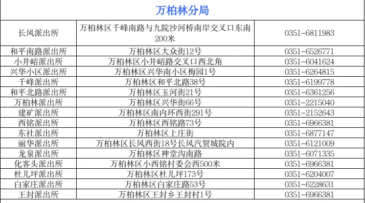 太原市万柏林区各户籍派出所窗口地址和服务电话信息表如下: