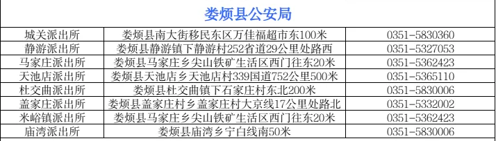娄烦县各辖区派出所户政服务地址和服务电话信息表: