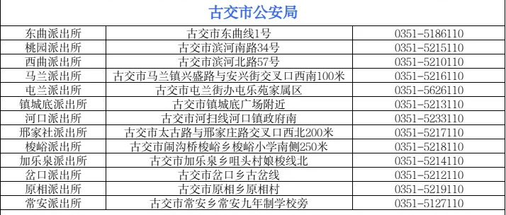 说明:关于古交市户政服务点(各派出所户籍办理地址和服务电话)信息作出免责声明:关于此信息作出免责声明,此信息图文仅供参考,小编不承担任何法律责任。此信息来源于有关机构的公开内容,在此经过整理并转载,唯一的目的是通过互联网传播便民惠民信息。由于时间等原因,难免使信息发生变更,此信息如有侵权,或者差错,请联系删除,直接联系秋果黄页网客服电话(187-8199-3958微信同号),一定会及时删除和修正。
