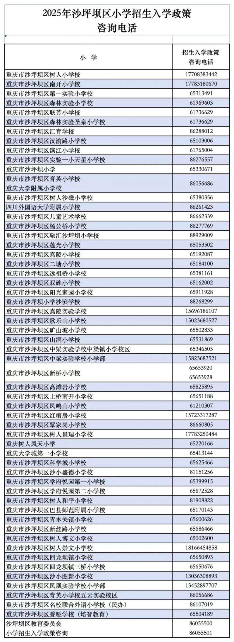 重庆市沙坪坝区2025年所有小学校招生入学政策咨询电话表如下:
