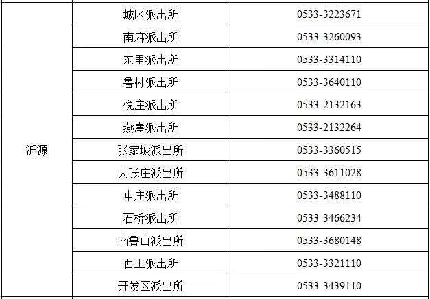 沂源县范围内各辖区派出所户政业务咨询电话表如下: