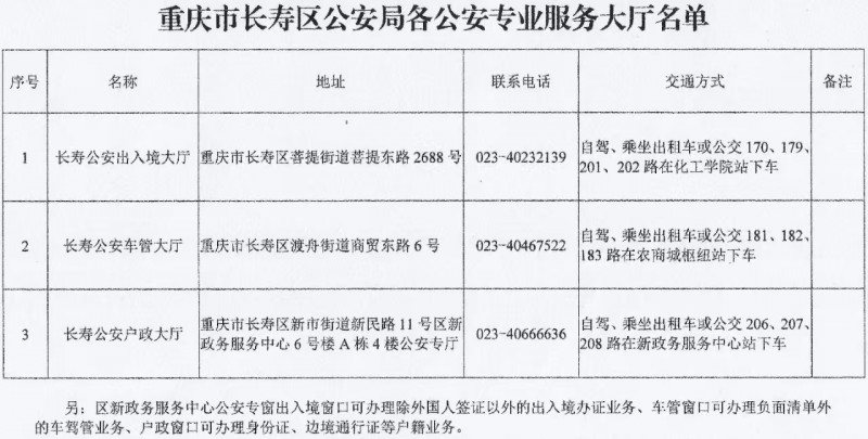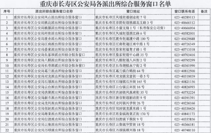 为方便企业、群众办证办事,现将重庆市长寿区范围内各辖区派出所综合服务窗口名单向社会公布。
