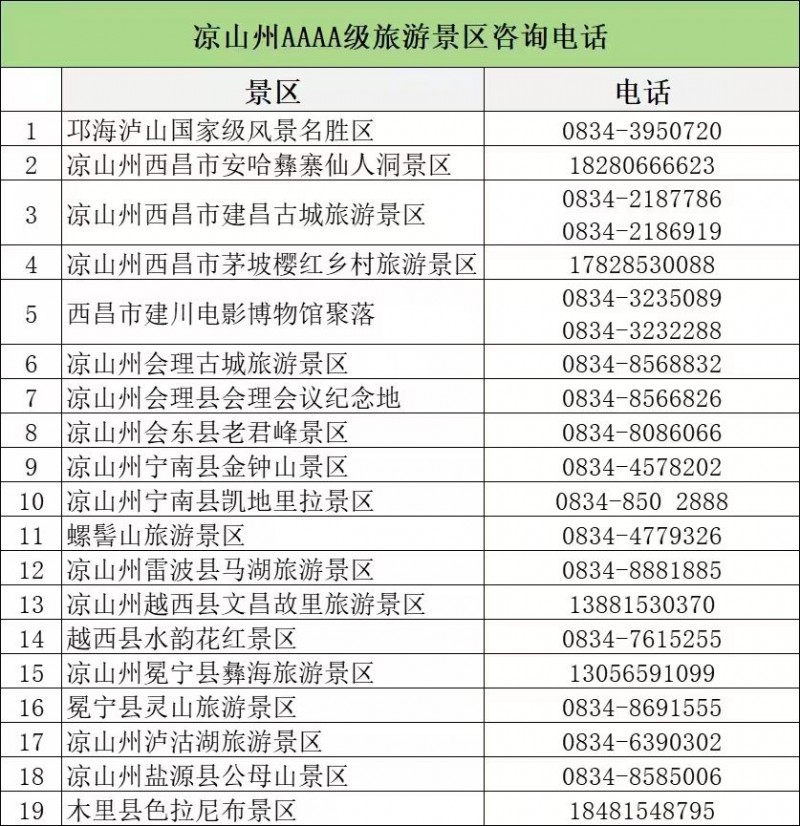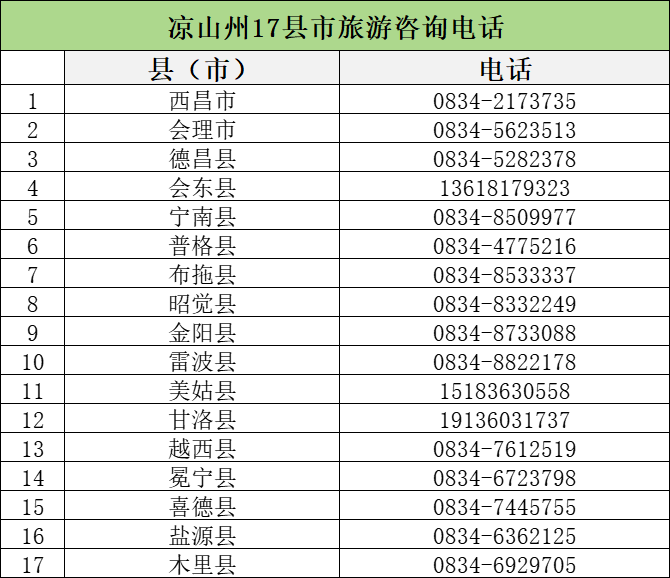 凉山州17县市旅游主管部门和全州AAAA级旅游景区旅游咨询电话大全如下: