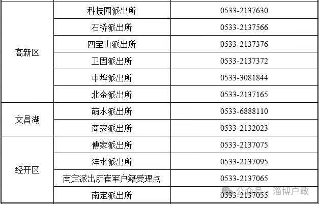 九,淄博市高新区、文昌湖和经开区各属地派出所户籍业务咨询预约电话: