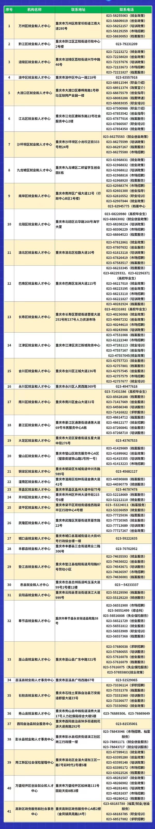重庆市各区县公共就业创业服务机构政策咨询电话目录: