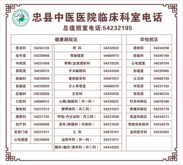 说明:关于忠县中医医院临床科室电话一览表的信息作出免责声明:关于此信息作出免责声明,此信息图文仅供参考,小编不承担任何法律责任。此信息来源于有关机构的公开内容,在此经过整理并转载,唯一的目的是通过互联网传播便民惠民信息。由于时间等原因,难免使信息发生变更,此信息如有侵权,或者差错,请联系删除,直接联系秋果黄页网客服电话(187-8199-3958微信同号),一定会及时删除和修正。