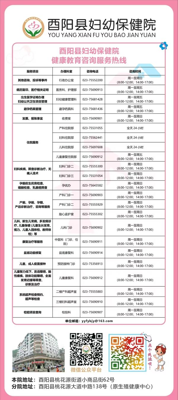 酉阳县妇幼保健院健康教育咨询服务热线一览表: