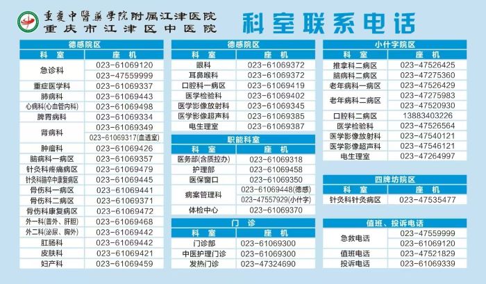 重庆市江津区中医医院24小时值班电话、医院三个院区地址如下: