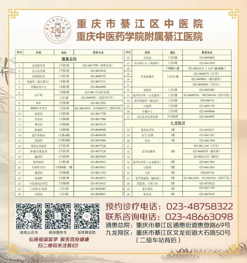 重庆市綦江区中医医院各业务科室联系电话信息表如下: