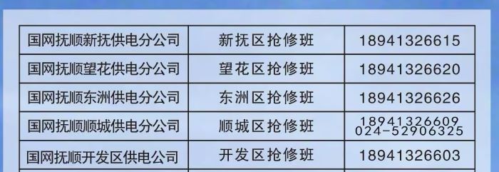 抚顺市供电公司各抢修班联系电话是多少啦?
