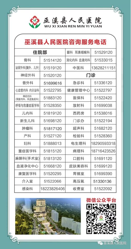 巫溪县人民医院住院部和门诊部咨询服务电话表: