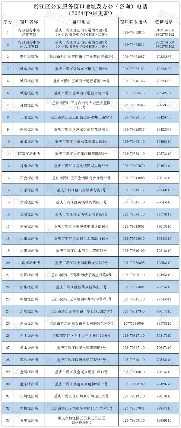 重庆市黔江区各个派出所综合服务窗口地址和办公(咨询)电话信息表:重庆市黔江区行政服务中心综合窗口电话是023-79332015,重庆市黔江区交警车辆管理所窗口电话是023-79323887。