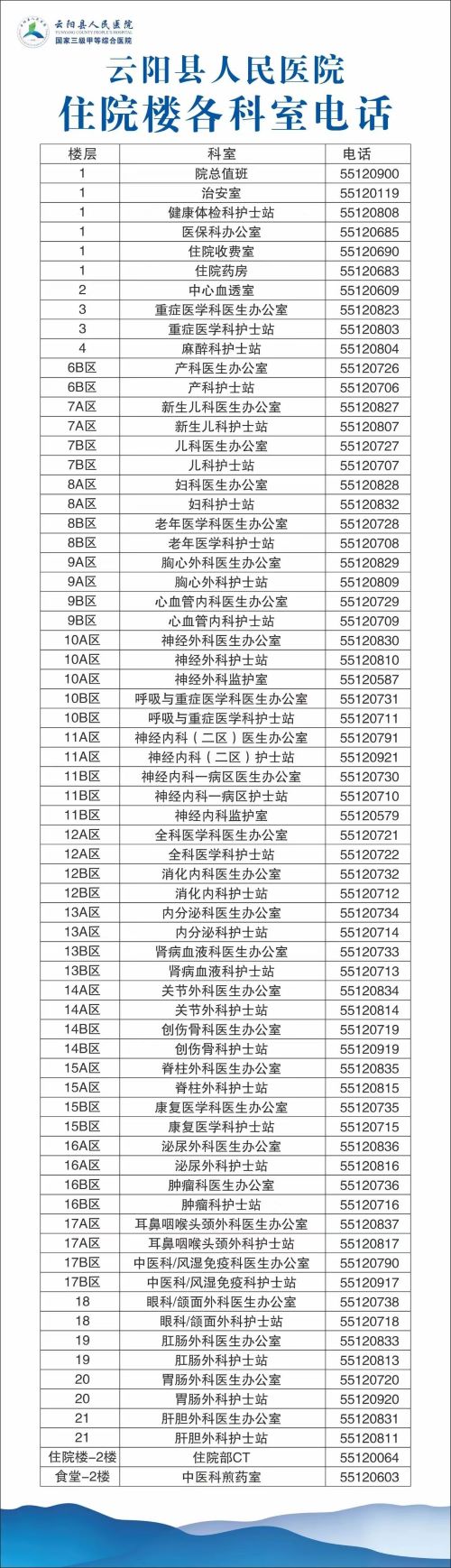为了进一步提升医疗服务质量,方便广大市民就医咨询,现将云阳县人民医院住院楼各科室联系电话公布如下: