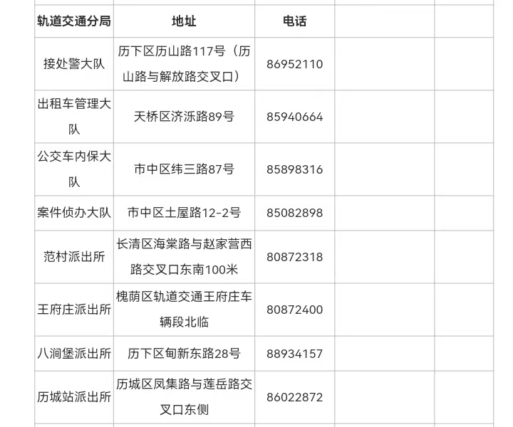济南市局轨道交通分局接警电话汇总如下: