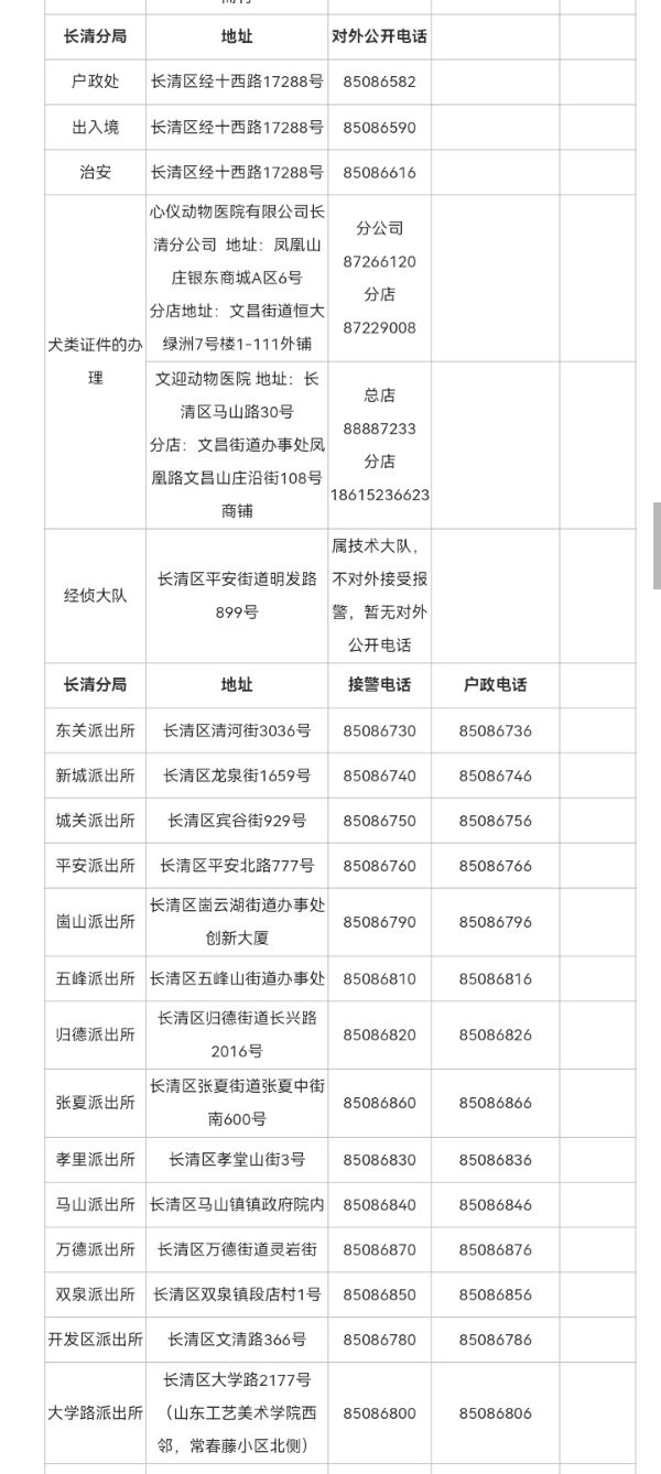 济南市长清区范围内各基层派出所接警电话和户政窗口电话