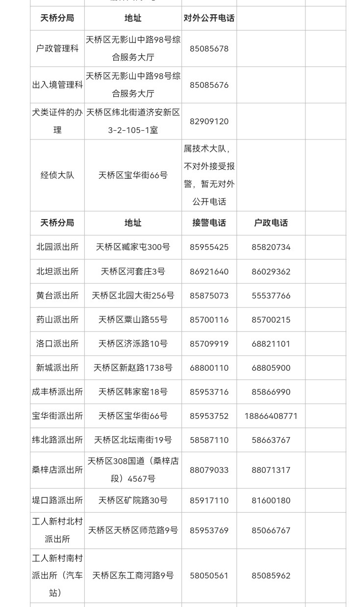 济南市天桥区全区各个派出所接警电话和户政窗口业务电话