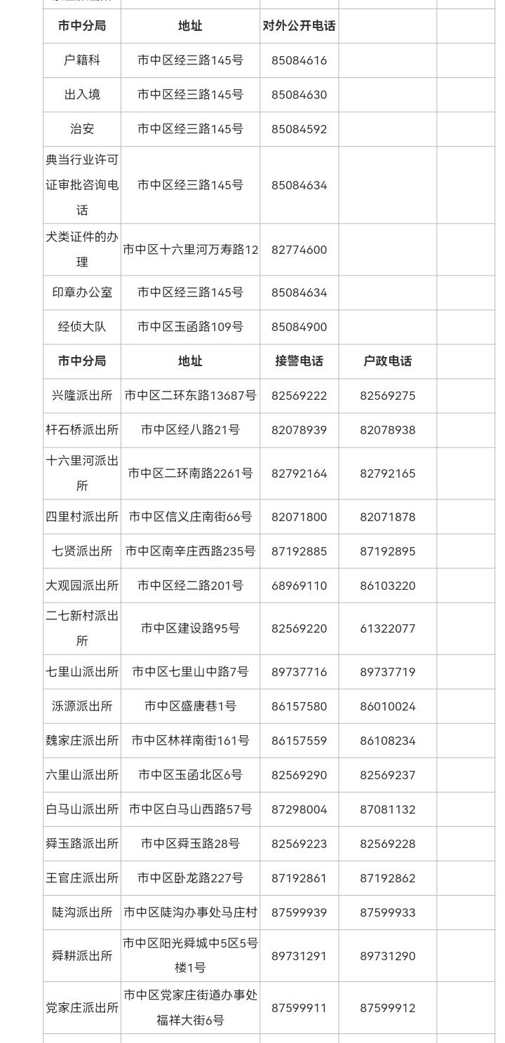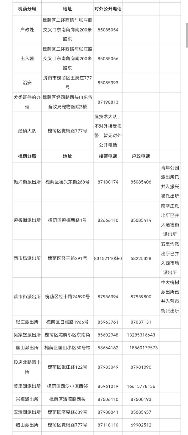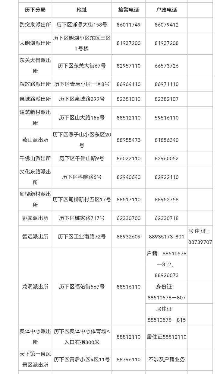 济南市全市派出所热线(各区县辖区派出所接警电话和户政电话)信息表: