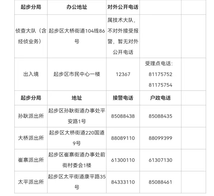 七,济南市起步区各派出所接警电话和户政窗口电话信息表: