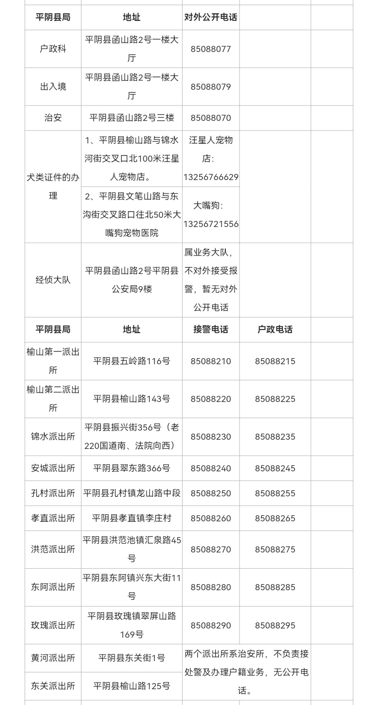 十一,济南市平阴县各派出所接警电话和户政窗口电话信息表: