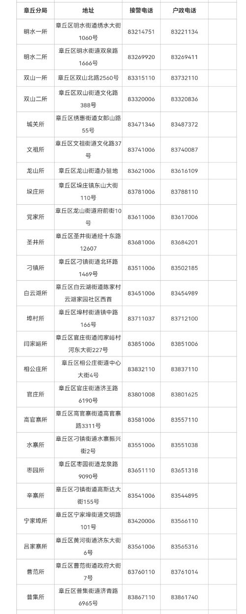 十,济南市章丘区各派出所接警电话和户政窗口电话信息表: