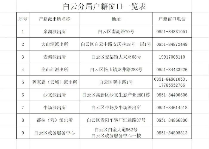 贵阳市白云区户籍热线(白云区各派出所户籍窗口电话)信息表如下: