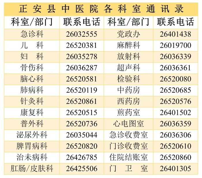 正安县中医医院各科室通讯录如下: