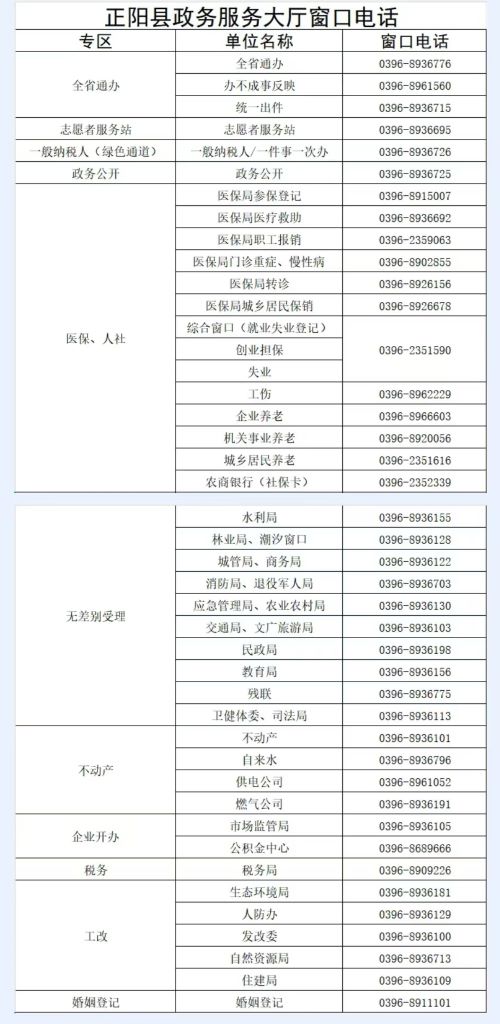 正阳县政务服务大厅各入驻单位业务窗口联系电话表如下: