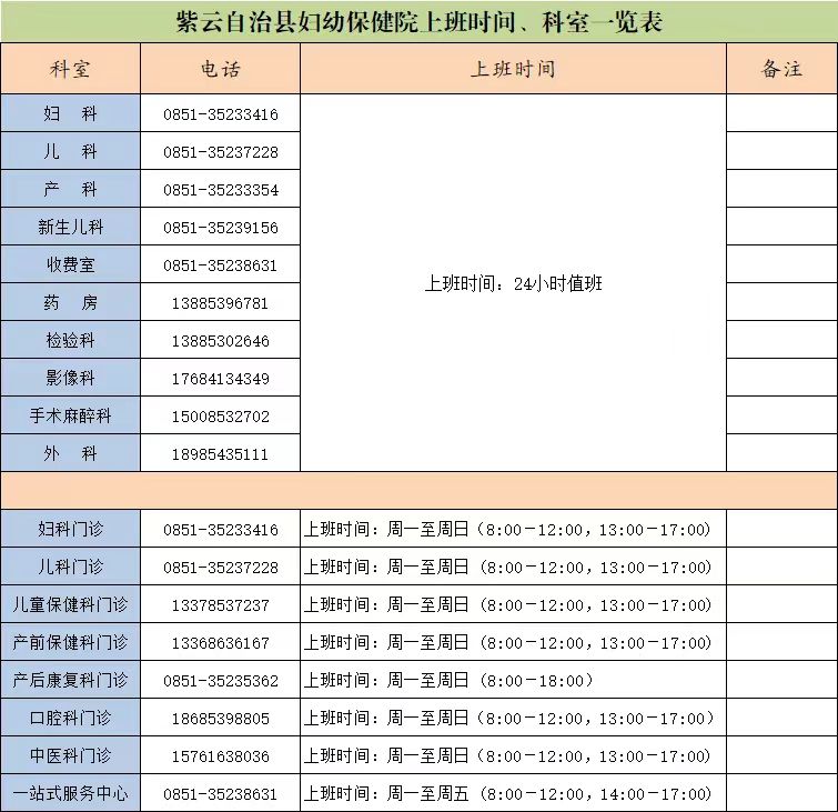 为了进一步提升医疗服务质量,方便广大市民就医咨询,现将紫云自治县妇幼保健院各科室联系电话公布如下:
