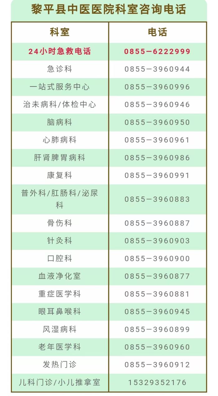 黎平县中医医院主要业务科室咨询电话表如下: