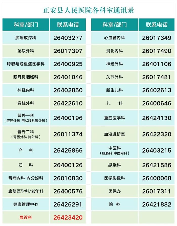 为了进一步提升医疗服务质量,方便广大市民就医咨询,现将正安县人民医院各科室通讯录公布如下: