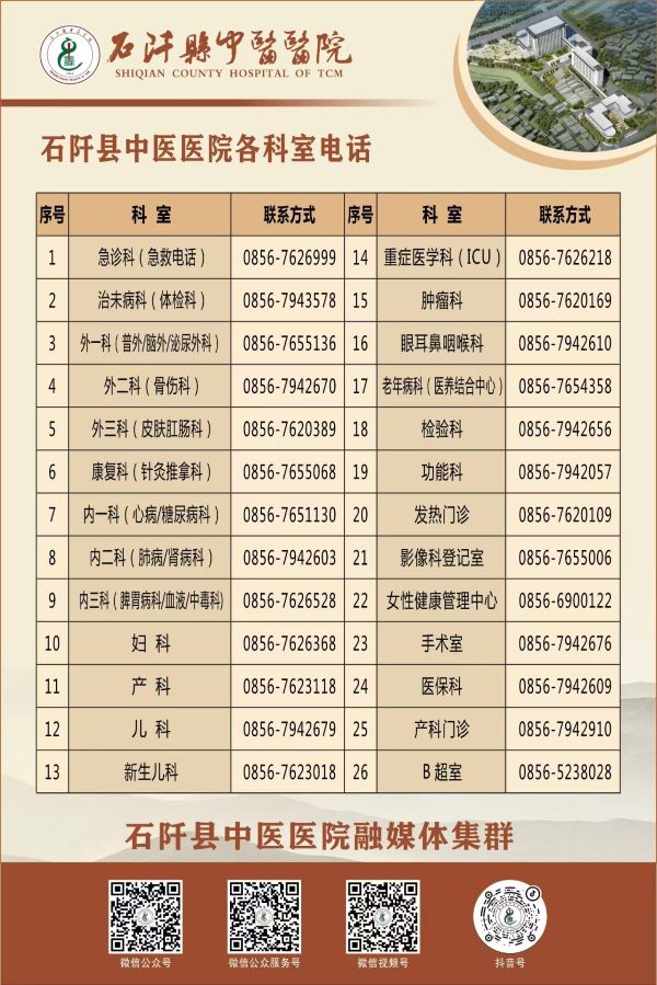 为了进一步提升医疗服务质量,方便广大市民就医咨询,现将石阡县中医医院各科室联系电话公布如下: