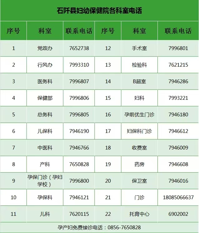 为了进一步提升医疗服务质量,方便广大市民就医咨询,现将石阡县妇幼保健院各科室联系电话公布如下:
