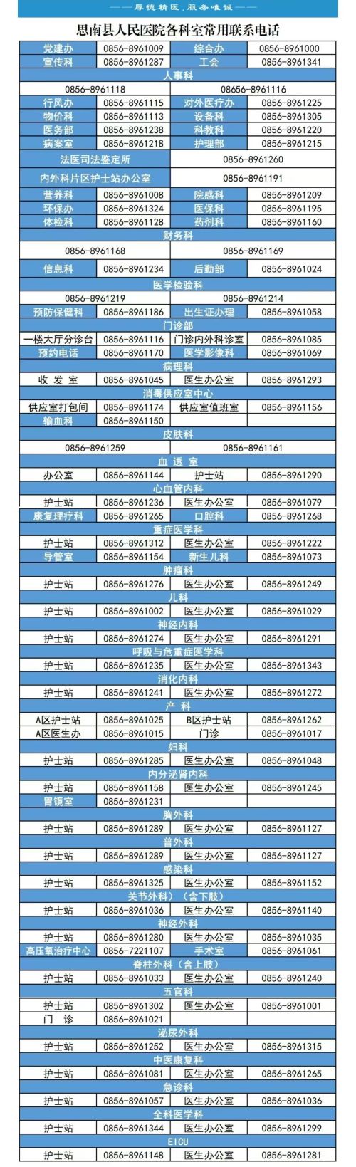 为了进一步提升医疗服务质量,方便广大市民就医咨询,现将思南县人民医院各科室常用联系电话公布如下: