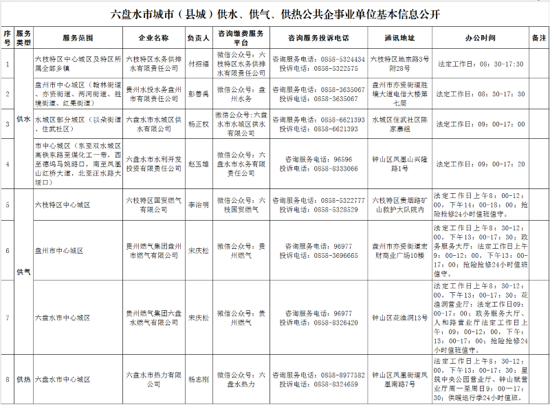 六盘水市城市(县城)供水、供气、供热公共企事业单位基本信息公开。为进一步提升城市(县城)供水、供气、供热公共事业服务质量和服务标准,提高办事效率和监督管理水平,及时处理群众诉求和意见建议,更好地服务群众,广泛接受社会各界监督,现将六盘水市城市(县城)供水、供气、供热公共企事业单位基本信息公开如下: