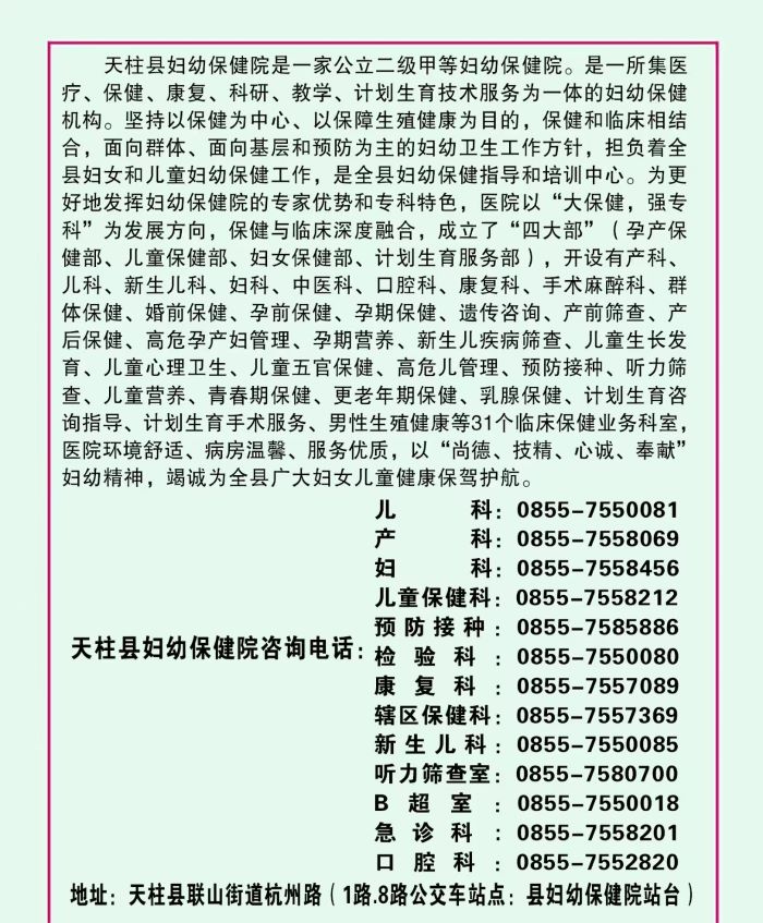 说明:关于天柱县妇幼保健院主要科室咨询电话的信息仅供参考。