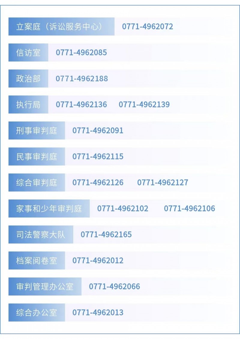 为进一步增进当事人与法官之间的有效沟通,满足人民群众多元化司法需求,现将南宁市江南区人民法院各审判执行及综合部门的电话予以发布,快一键收藏起来吧!南宁市江南区人民法院各审判执行及综合部门对外联系电话如下:
