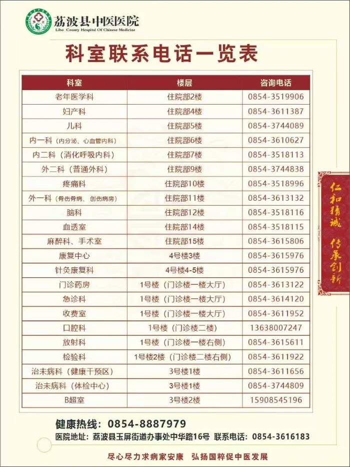 为了进一步提升医疗服务质量,方便广大市民就医咨询,现将荔波县中医医院各科室联系电话一览表公布如下:荔波县中医医院将始终以卓越的医疗技术贴心的服务和先进的设备为您的健康保驾护航。感谢您的信任与选择,祝您早日康复,健康常伴!
