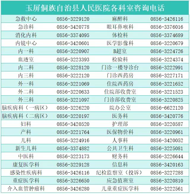为了进一步提升医疗服务质量,方便广大市民就医咨询,现将玉屏侗族自治县人民医院各科室业务咨询电话公布如下:玉屏侗族自治县人民医院将始终以卓越的医疗技术贴心的服务和先进的设备为您的健康保驾护航。感谢您的信任与选择,祝您早日康复,健康常伴!
