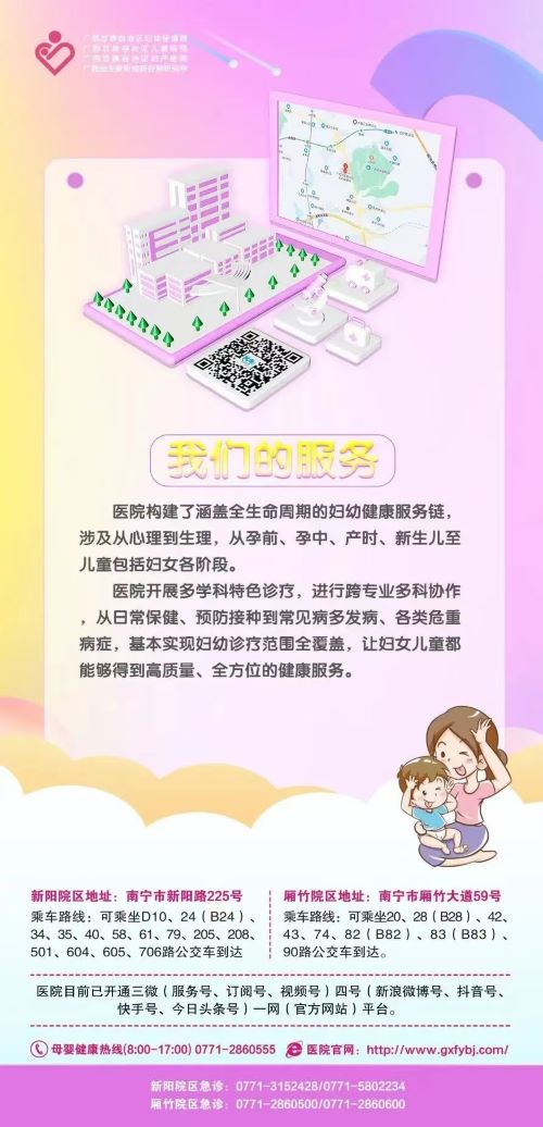 ☎母婴热线:0771-2860555,⏰服务时间:8:00-17:00。 ☎厢竹院区(儿童医疗中心)一站式服务中心:0771- 3918808,(妇产院区)一站式服务中心:0771-2860601, ⏰服务时间:每日07:30-18:00