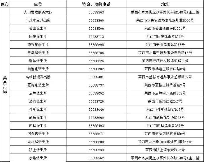 为进一步方便广大市民群众,青岛市户政机关将青岛莱西市户政系统窗口服务电话公布给大家,如有户籍相关业务需要办理,可以拨打电话咨询。青岛莱西市各辖区派出所户籍窗口咨询预约电话和地址信息表如下: