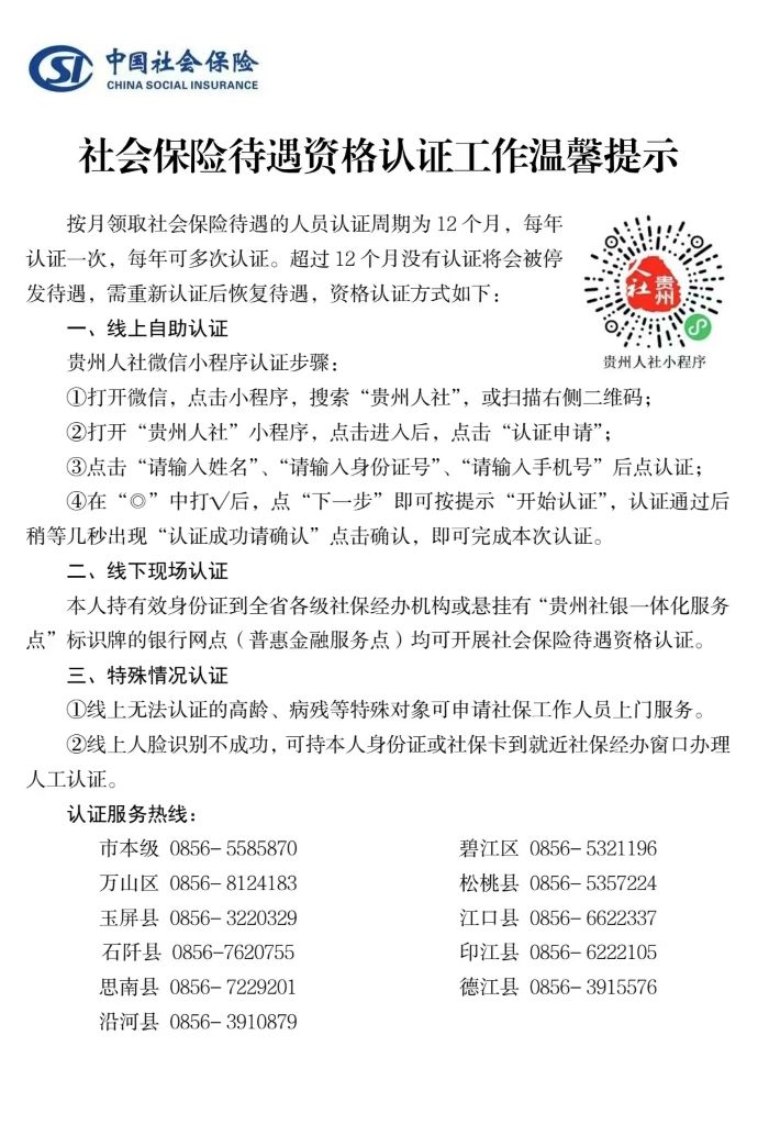 铜仁市社会保险待遇领取资格认证服务热线如下:
