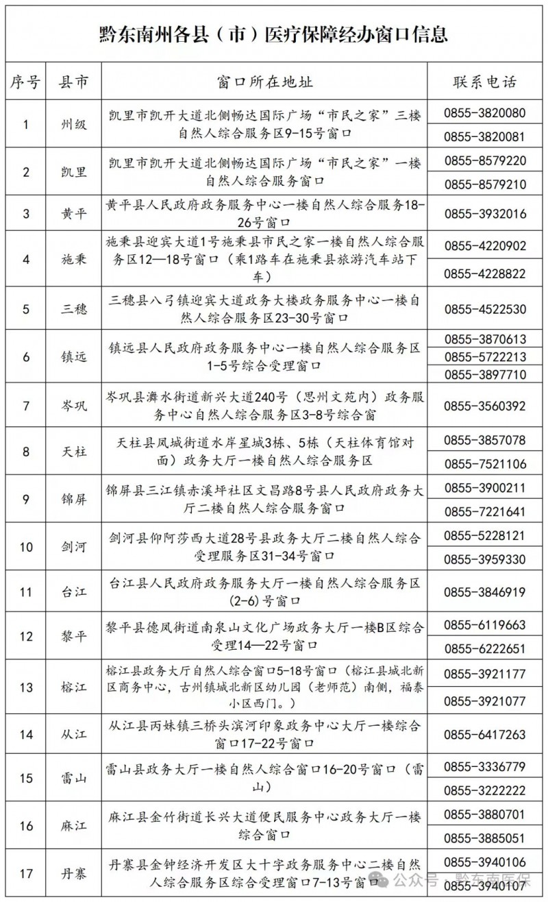 黔东南州各县(市)医疗保障经办窗口地址和联系电话信息表如下:黔东南州医保经办窗口地址和电话、黔东南州凯里市医保经办窗口地址和电话、黔东南州黄平县医保经办窗口地址和电话、黔东南州施秉县医保经办窗口地址和电话、黔东南州三穗县医保经办窗口地址和电话、黔东南州镇原县医保经办窗口地址和电话、黔东南州岑巩县医保经办窗口地址和电话、黔东南州天柱县医保经办窗口地址和电话、黔东南州锦屏县医保经办窗口地址和电话、黔东南州剑河县医保经办窗口地址和电话、黔东南州台江县医保经办窗口地址和电话、黔东南州黎平县医保经办窗口地址和电话、黔东南州榕江县医保经办窗口地址和电话、黔东南州从江县医保经办窗口地址和电话、黔东南州雷山县医保经办窗口地址和电话、黔东南州麻江县医保经办窗口地址和电话、黔东南州丹寨县医保经办窗口地址和电话。