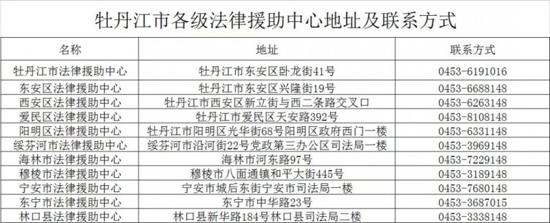 牡丹江市各级法律援助中心地址和联系方式信息表如下: