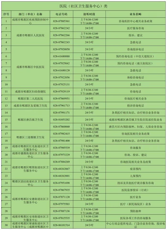 成都市新都区范围内公立医院(社区卫生服务中心)电话号码表如下: