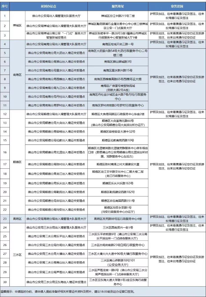佛山市全市各区出入境证件受理点服务地址信息表如下:
