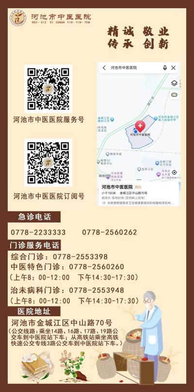 说明:关于河池市中医医院门诊服务电话的信息作出特别说明:本信息立足为社会大众提供有价值的参考资料和办事指南等公共信息,部分图文来源于网络或者有关机构公开内容,属于公益性的分享与传播。虽然尽力确保内容的准确性和实效性,但由于各种因素,难免存在疏忽和差错,敬请不吝赐教,欢迎相互交流,共同学习。对信息中陈述、观点判断保持中立,版权属原作者所有,如涉侵权或者差错等问题,请联系网络信息推广平台秋果黄页网客服(187/8199/3958微信同号),一定会及时删除或者修正。谢谢!