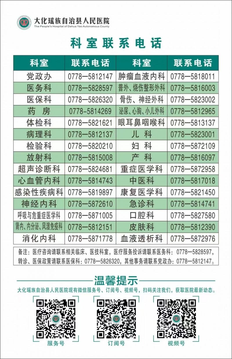 大化县人民医院瑶族自治县人民医院各业务科室联系电话表如下: