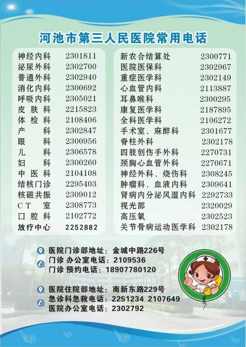 说明:关于河池市第三人民医院各科室常用电话表的信息作出特别说明:本信息立足为社会大众提供有价值的参考资料和办事指南等公共信息,部分图文来源于网络或者有关机构公开内容,属于公益性的分享与传播。虽然尽力确保内容的准确性和实效性,但由于各种因素,难免存在疏忽和差错,敬请不吝赐教,欢迎相互交流,共同学习。对信息中陈述、观点判断保持中立,版权属原作者所有,如涉侵权或者差错等问题,请联系网络信息推广平台秋果黄页网客服(187/8199/3958微信同号),一定会及时删除或者修正。谢谢!