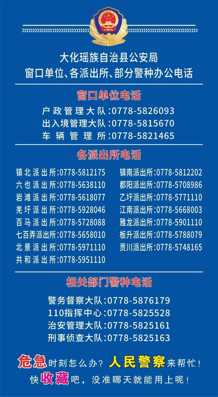 为进一步强化为民服务意识,畅通为民服务渠道,扎实推进政务公开、便民服务,尽最大努力方便广大市民咨询政策、办事、反映诉求,小编整理发布了大化县各派出所值班电话和户政、车管所、出入境窗口服务电话