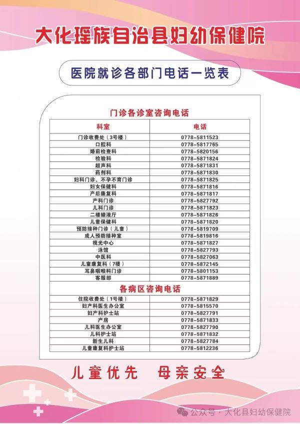 为了进一步提升医疗服务质量,方便广大市民群众就医咨询,现将大化瑶族自治县妇幼保健院就诊各部门电话一览表公布如下: